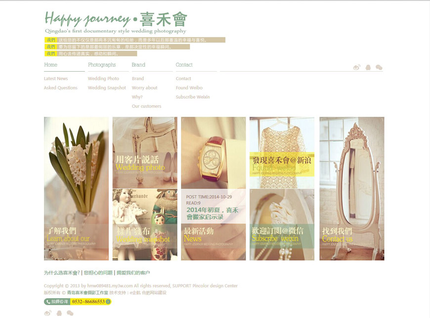 青岛喜禾会摄影工作室成立于2014年初,是青岛一家以私人定制,纯粹纪实风格的婚纱摄影机构。本工作室以其专业的摄影理念,和极富创新精神的态度,抛弃了传统影楼呆板的模式化拍摄方式,追求“轻松,自由,真实”的宗旨,完美还原“幸福”本质。感受生活,追求幸福的含义,是我们毕生追逐的梦想。我们拥有全国优秀的技术人才,高端定制的全新服务理念,前瞻性的公司发展战略,专注于为客户提供高品质的摄影作品和优质服务,倡导电影剧情式外景拍摄新手法,为客户量身打造只属于自己的摄影剧情和高品质摄影作品。让您在拍摄中,找到旅行的快乐。青岛喜禾会摄影工作室这个网站是与企航网络的第二次合作,两次合作均得到了客户的高度认可。