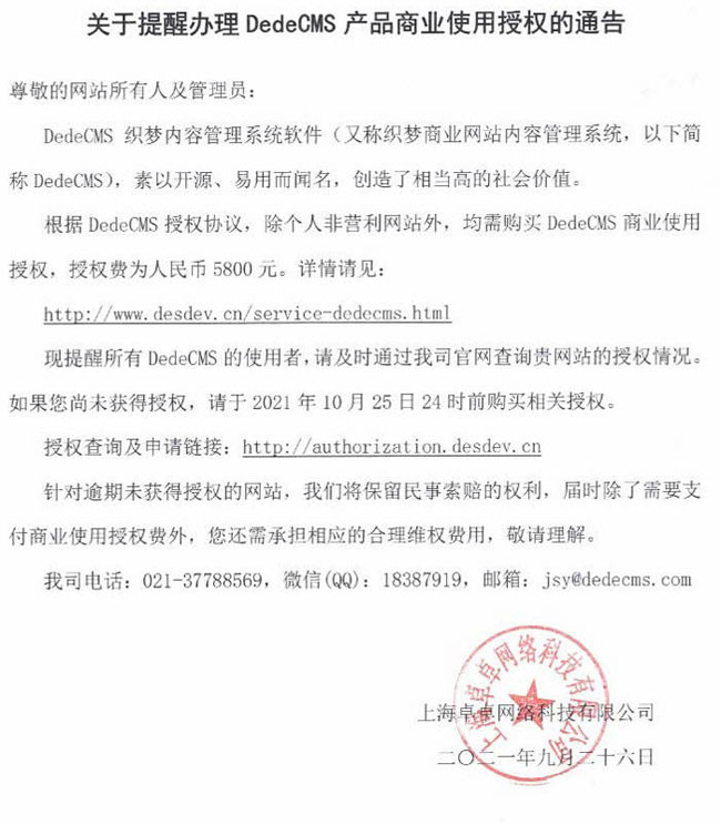 昨晚dedecms(织梦)发布公告:除个人非盈利网站外,均需要购买DedeCMS商业使用授权,授权费为5800元。针对逾期未获得授权的网站,我们将保留民事索赔权利,届时除了需需要支付商业使用授权费外,您还需承担相应的合理维权费用。