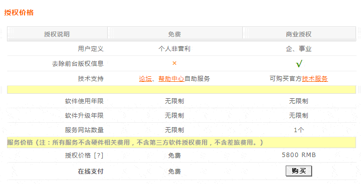 同时,我们在其官网上也看到了收费明细,商业授权5800元,仅能使用一个网站,而一定要注意“个人非盈利”。