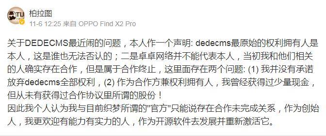 在之后,DEDECMSv6开发团队授权人柏拉图出来发声表示说:DEDECMS最原始的权利拥有人是自己,当初只是跟卓卓网络合作,现在合作终止了,他们代表不了自己,并且织梦DEDECMS所有著作权也是自己的,作为创始人, (1)我并没有承诺放弃DEDECMS全部权利,(2) 作为合作方兼权利拥有人,我曾经获得过少量现金,但从未有获得过合作协议里所谓的股份!
